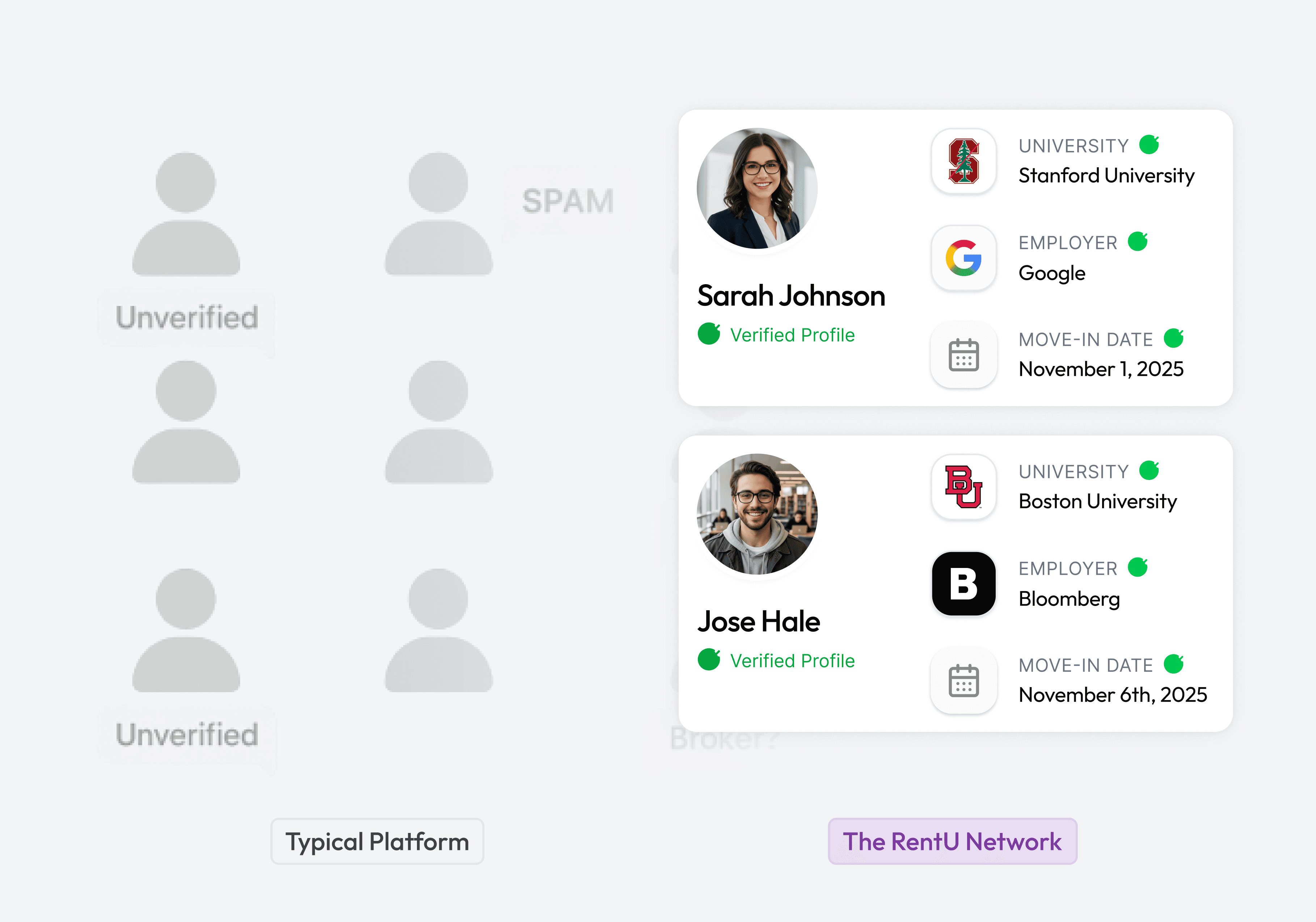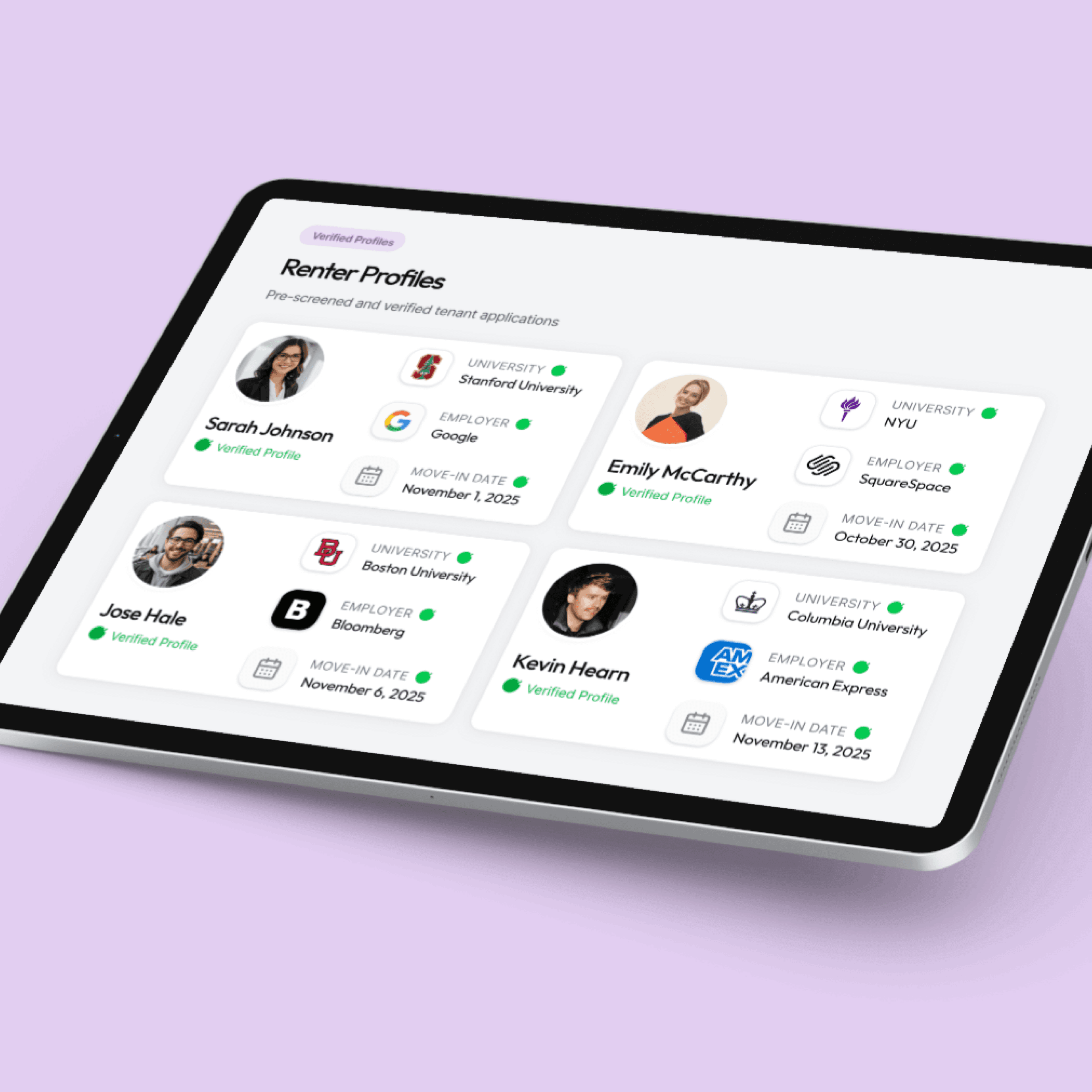 Every renter is authenticated, employed, and part of a trusted network — making your next lease smoother and safer.
